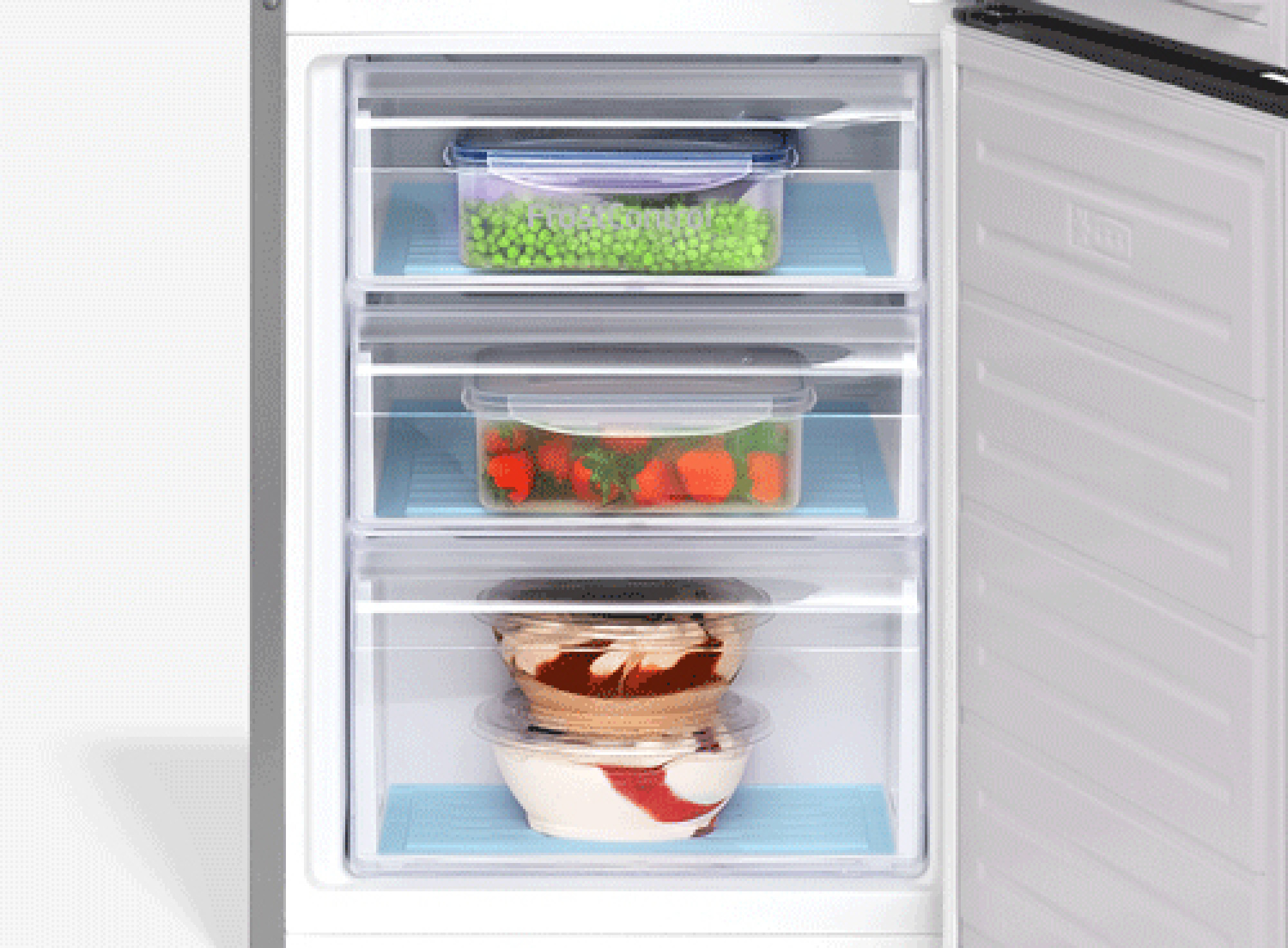 Kar pozabili boste, kako odmrzniti zamrzovalnik. S tehnologijo FrostControl se led ne nabira med predali, čiščenje in odmrzovanje naprave pa je izjemno enostavno in hitro. Zaslugo za to ima izvirno nameščen uparjalnik. Poleg tega boste pridobili več prostora za izdelke. FrostControl ne pomeni le manj obveznosti, temveč tudi več higiene in prostora. Od zdaj naprej bo vsako odmrzovanje trajalo dobesedno le trenutek!