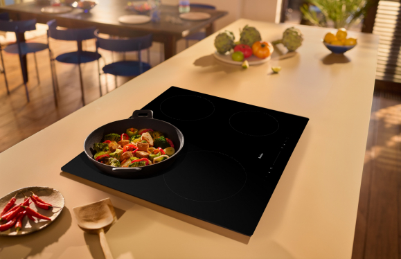 Večkratno dotikanje senzorja za povečanje ali zmanjšanje moči segrevanja ni najbolj praktično. Zlasti je nepraktično, kadar je treba hitro znižati temperaturo, sicer bo jed skipela. Za rešitev te težave so indukcijska kuhališča Amica opremljena z drsnikom, s katerim lahko spreminjamo nastavitev kuhališča hitro in zvezno. Treba je samo podrsati s prstom po nadzorni plošči. Preprosto, priročno in uporabno!
